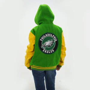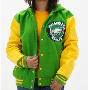 Women's Philadelphia Eagles Letterman Hoodie Jacket Wool Varsity Jacket Is Made Of Premium Melton Wool, While The Jacket Sleeves Are Made Of Premium Geniune Leather. This Varsity Jacket Comes With Kelly Green Wool Body, Yellow Leather Sleeves And Kelly Green Rib With Yellow Stripes.