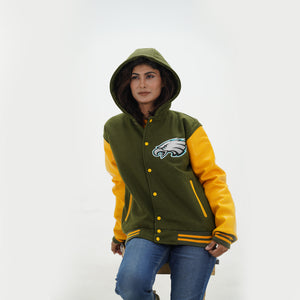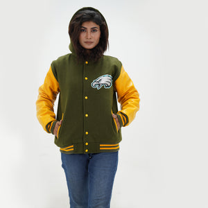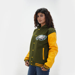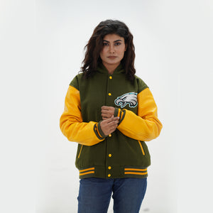 Women's Philadelphia Eagles Varsity Jacket Leather Arms And Wool Body Is Made Of Premium Melton Wool, While The Jacket Sleeves Are Made Of Premium Geniune Leather. This Varsity Jacket Comes With Green Wool Body, Yellow Leather Sleeves And Yellow Rib With Yellow Stripes.