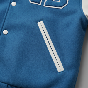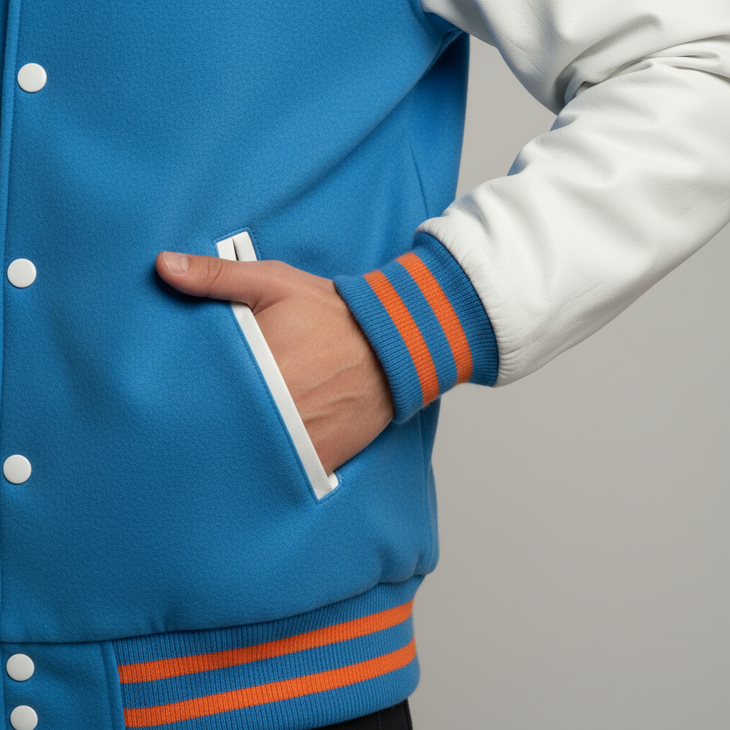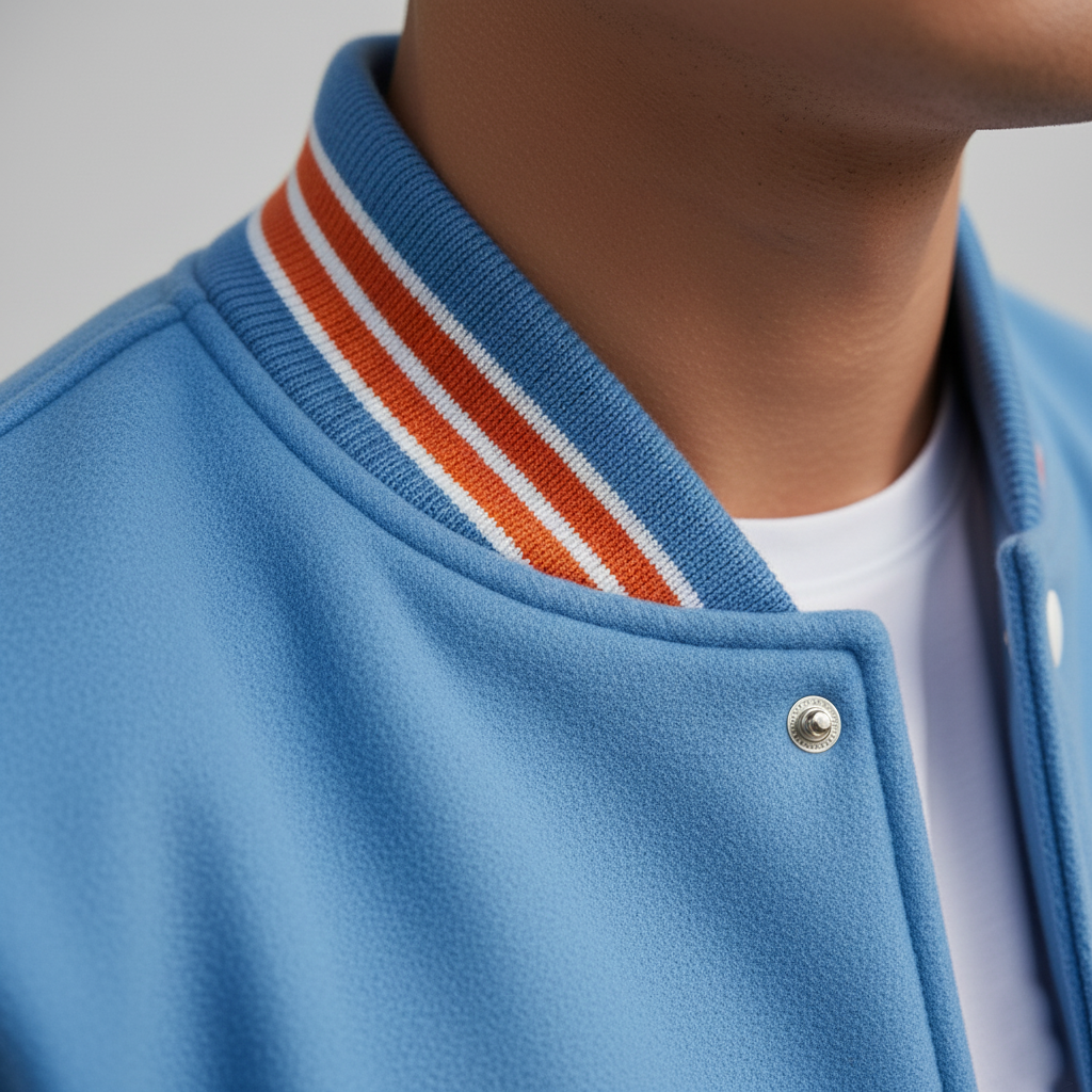 Light blue and white varsity jacket with orange 'CU' letter patch, worn by a student