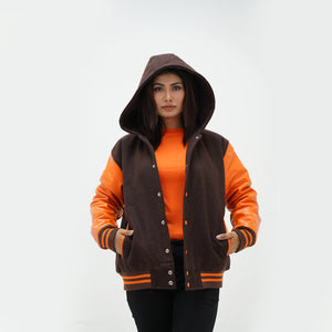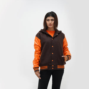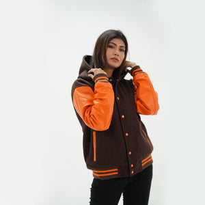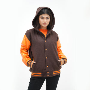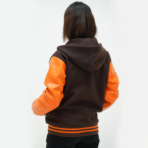 Women's Chocolate Brown Body And Old Gold Leather Arms Varsity Jacket With Hood