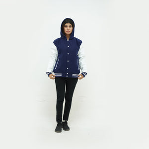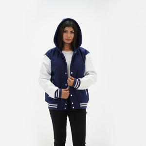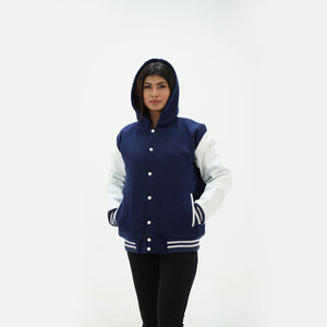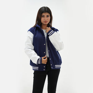 Women's Navy Blue Letterman Hooded Jacket Leather Arms And Wool Body Is Made Of Premium Melton Wool, While The Jacket Sleeves Are Made Of Premium Geniune Leather. This Varsity Jacket Comes With Navy Blue Wool Body, White Leather Sleeves And Navy Blue Rib With White Stripes.