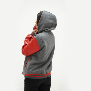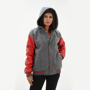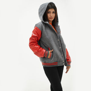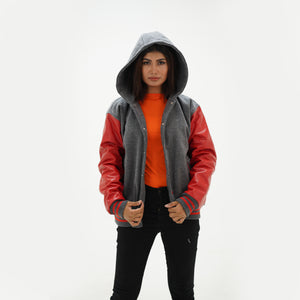 Women's Red And Gray Varsity Jacket With Hood Leather Sleeves Wool Body