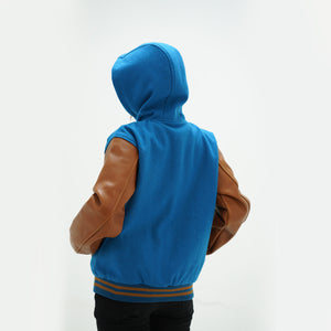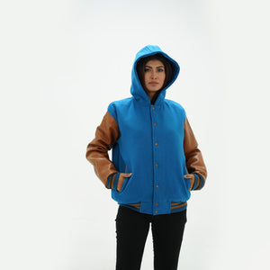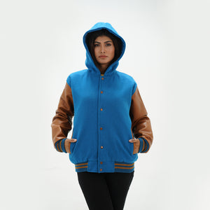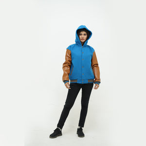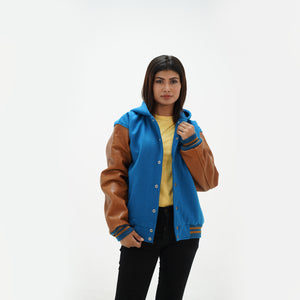 Women's Sky Blue Body And Brown Leather Sleeves Varsity Jacket With Hood