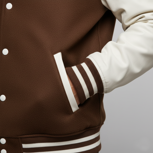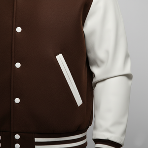 The signature contrast of brown with white sleeves gives this jacket its iconic letterman style. This brown letterman jacket with white sleeves features ribbed cuffs, collar, and hem for a secure, structured fit. Perfect for students, fans, and fashion-conscious buyers, it balances traditional varsity heritage with contemporary style.