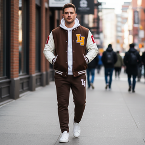 Combining contemporary streetwear style with traditional varsity elements, this modern brown varsity jacket with classic look is ideal for fashion-forward men who want both style and authentic varsity spirit.
