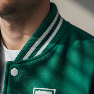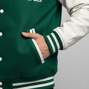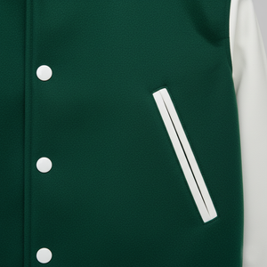 Combining modern streetwear style with authentic varsity design, this modern green varsity jacket with classic look is perfect for fashion-conscious men and varsity fans alike.