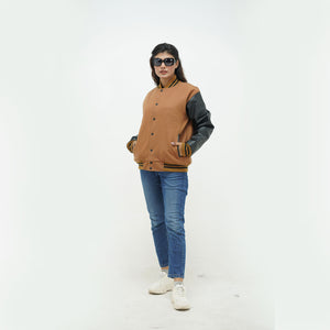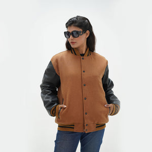 Brown And Black Letterman Jacket Is Made Of Premium Melton Wool, While The Jacket Sleeves Are Made Of Premium Geniun Leather. This Varsity Jacket Comes With Brown Wool Body, Black Leather Sleeves And Black Rib With Black Stripes.
