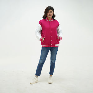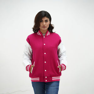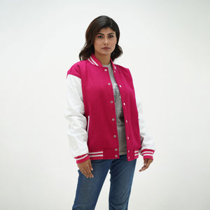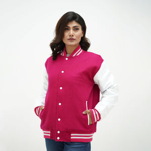 Pink And White Collegiate Letterman Jacket Leather Arms And Wool Body Is Made Of Premium Melton Wool, While The Jacket Sleeves Are Made Of Premium Geniune Leather. This Varsity Jacket Comes With Pink Wool Body, White Leather Sleeves And Pink Rib With White Stripes.
