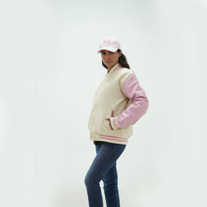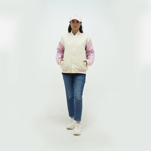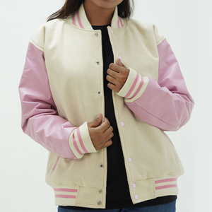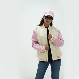 Off White And Pink Letterman Jacket Women's Leather Arms And Wool Body Varsity Jacket