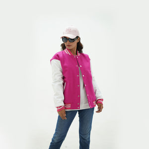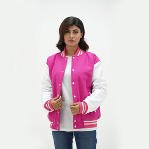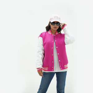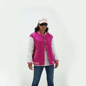 Pink And White Letterman Jacket Is Made Of Premium Melton Wool, While The Jacket Sleeves Are Made Of Premium Geniune Leather. This Varsity Jacket Comes With Pink Wool Body, White Leather Sleeves And Pink Rib With White Stripes.