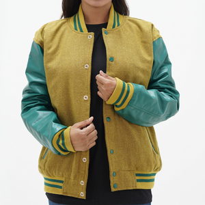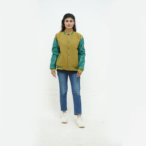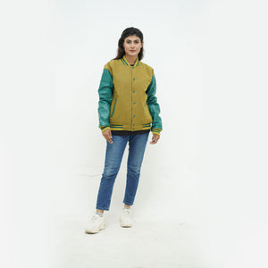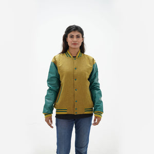 Women's Camel Wool Body And Green Leather Sleeves Varsity Jacket