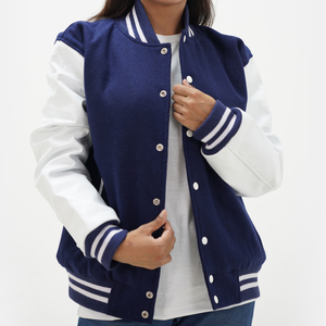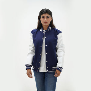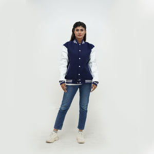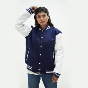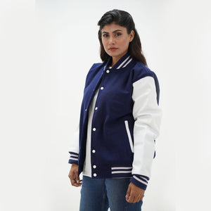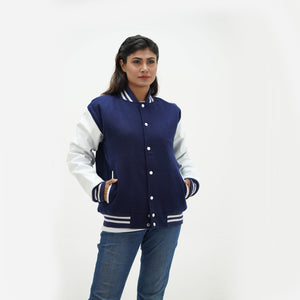 Women's Navy Blue Letterman Jacket Leather Arms And Wool Body Varsity Jacket Is Made Of Premium Melton Wool, While The Jacket Sleeves Are Made Of Premium Geniune Leather. This Varsity Jacket Comes With Navy Blue Wool Body, White Leather Sleeves And Navy Blue Rib With White Stripes.