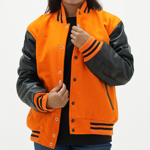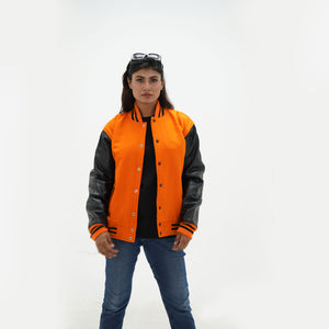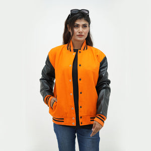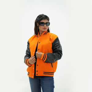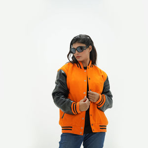 Women's Orange Wool Body And Black Leather Sleeves Varsity Jacket Is Made Of Premium Melton Wool, While The Jacket Sleeves Are Made Of Premium Geniune Leather. This Varsity Jacket Comes With Orange Wool Body, Black Leather Sleeves And Orange Rib With Black Stripes.