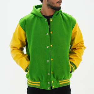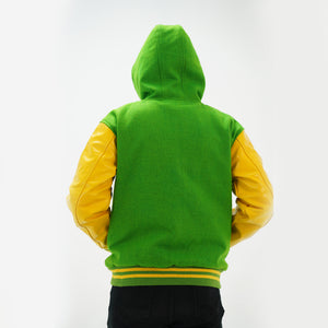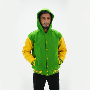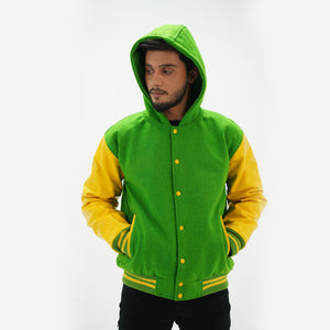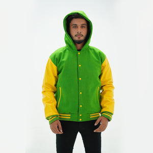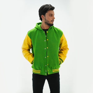 Men's Kelly Green Hoodie Letterman Jacket Leather Arms And Wool Body Is Made Of Premium Melton Wool, While The Jacket Sleeves Are Made Of Premium Geniune Leather. This Varsity Jacket Comes With Kelly Green Wool Body, Yellow Leather Sleeves And Kelly Green Rib With Yellow Stripes.