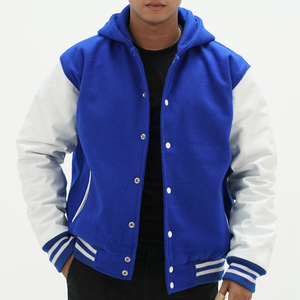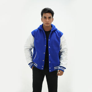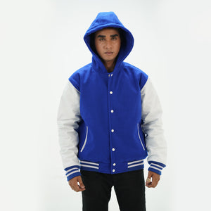 Men's Royal Blue Letterman Jacket With Hood Leather Arms And Wool Body Is Made Of Premium Melton Wool, While The Jacket Sleeves Are Made Of Premium Geniune Leather. This Varsity Jacket Comes With Royal Blue Wool Body, White Leather Sleeves And Royal Blue Rib With White Stripes.