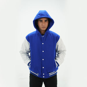 Men's Royal Blue Letterman Jacket With Hood Leather Arms And Wool Body